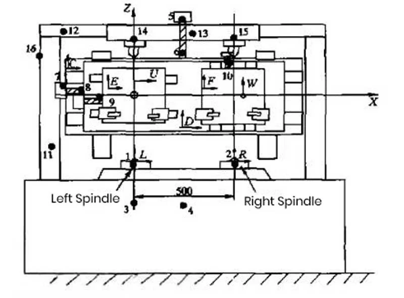 This study involves a machine tool with both left and right spindles, requiring the creation of two separate Tolerance mathematical models. Since the homogeneous coordinate transformation method is used to derive the Tolerance mathematical model, a series of coordinate systems must be established to calculate the Tolerance between the tool tip and the workpiece. The reference coordinate system A is fixed on the machine bed. Coordinate systems O and R are set on the left and right spindles, respectively, and move with their thermal deformations. Coordinate systems C, D, E, and F are set on the large carriage (Z-axis carriage), middle carriage (X-axis carriage), left small carriage (U-axis carriage), and right small carriage (W-axis carriage), respectively, and move with the carriages and their thermal deformations.